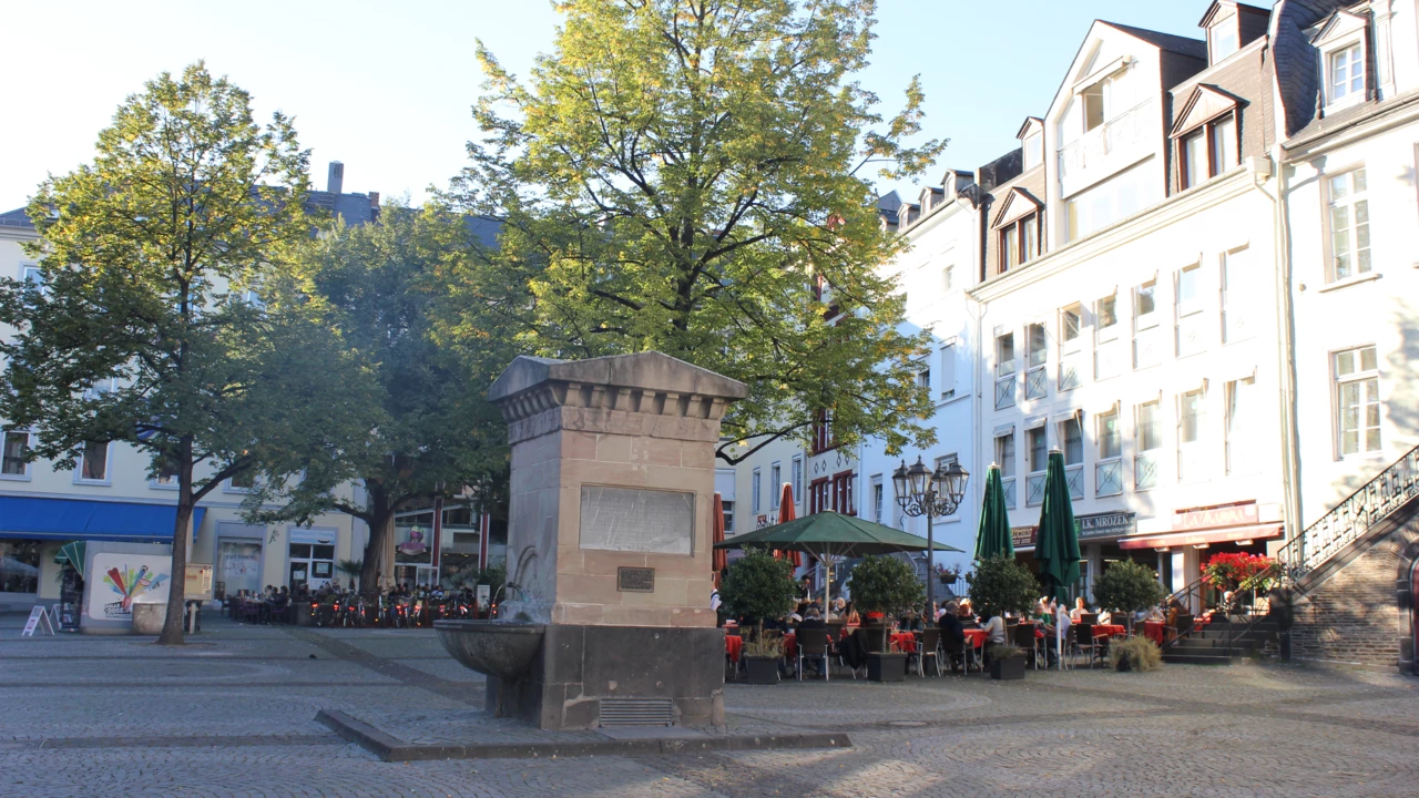 Der Brunnen in der Mitte des Platzes versorgte die Koblenzer Bürger ab 1806 mit Trinkwasser aus der Metternicher Wasserleitung, die für das Kurfürstliche Schloss gebaut wurde.