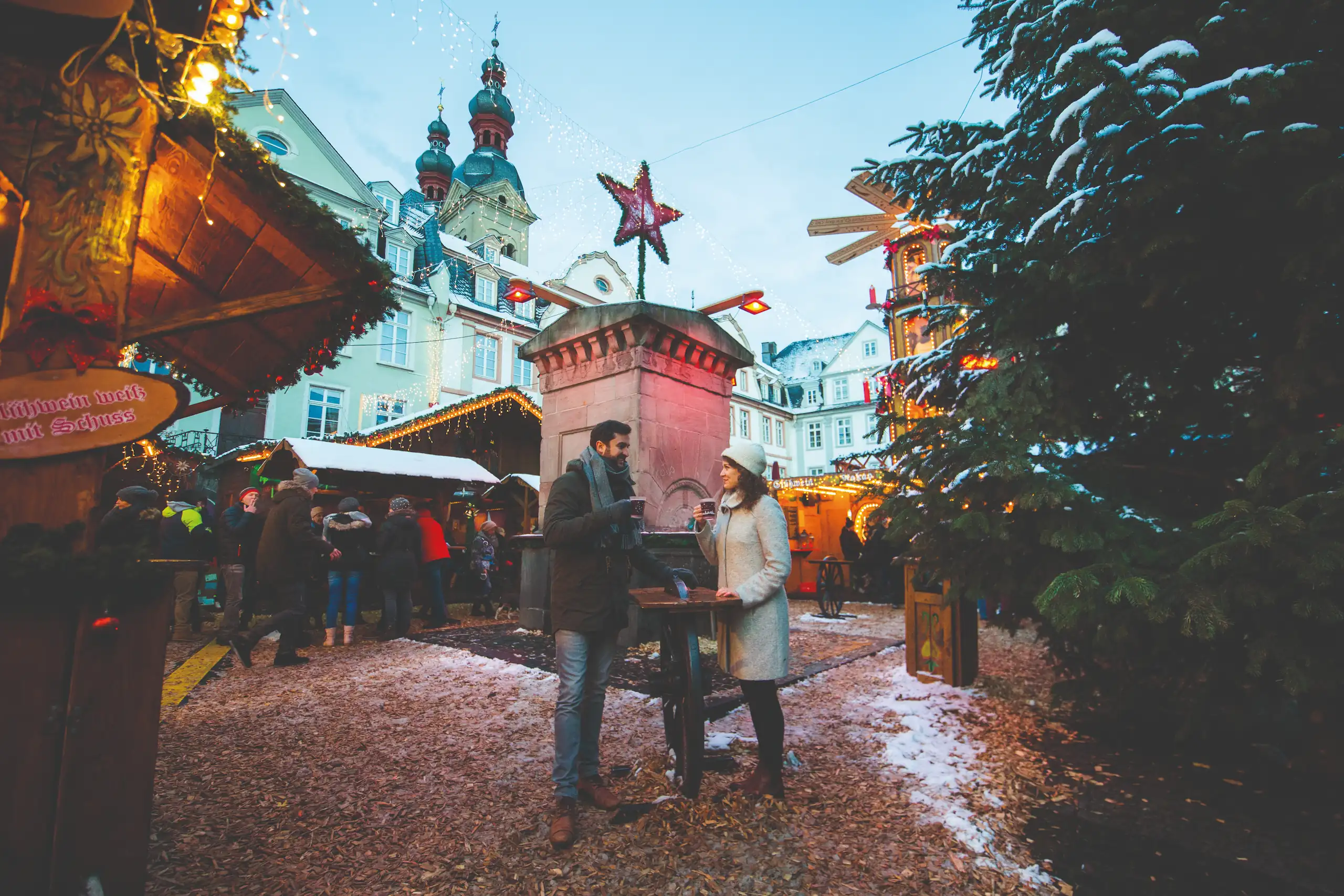 Koblenz is also worth a visit during the Advent season! Beautifully illuminated with traditional wooden stalls, the Christmas market is located in the middle of the old town and extends across seven historic squares.