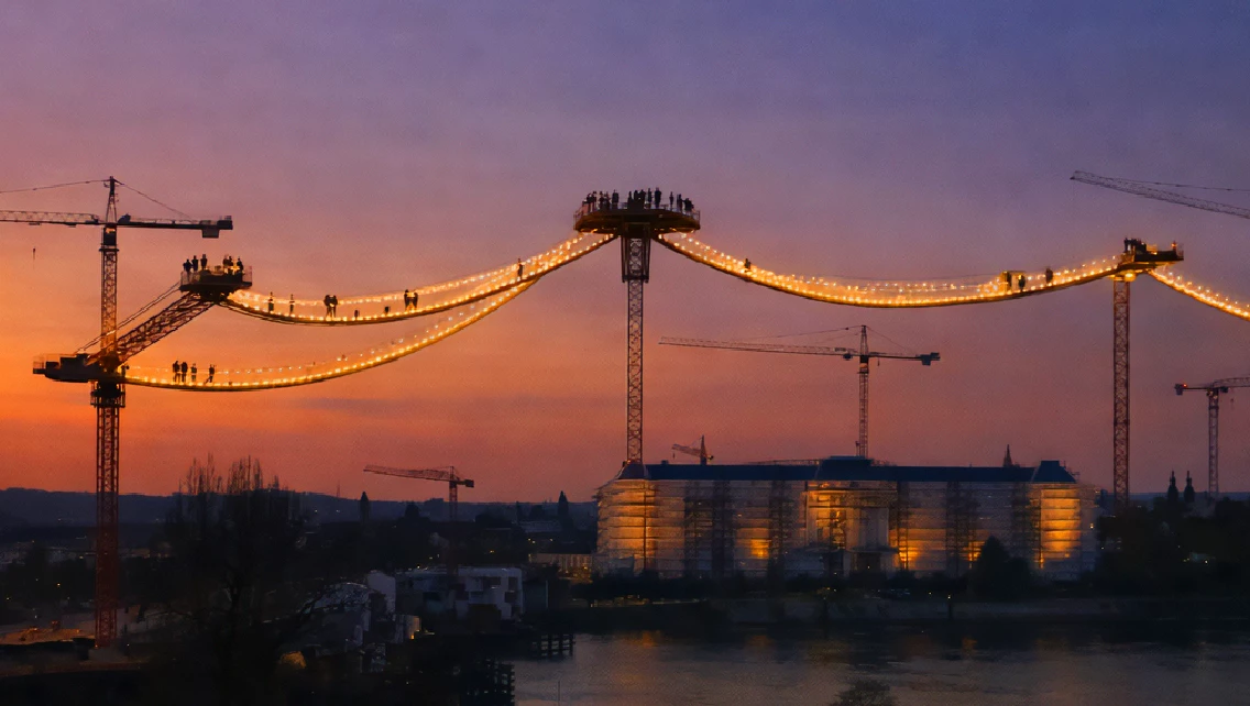 Seit Monaten prägen sie das Koblenzer Stadtbild: die Kräne rund um die Pfaffendorfer Brücke und das Kurfürstliche Schloss. Sie wachsen in den Himmel, drehen bei Wind ihre Bahnen – und lassen erahnen, dass hier etwas Großes entsteht.